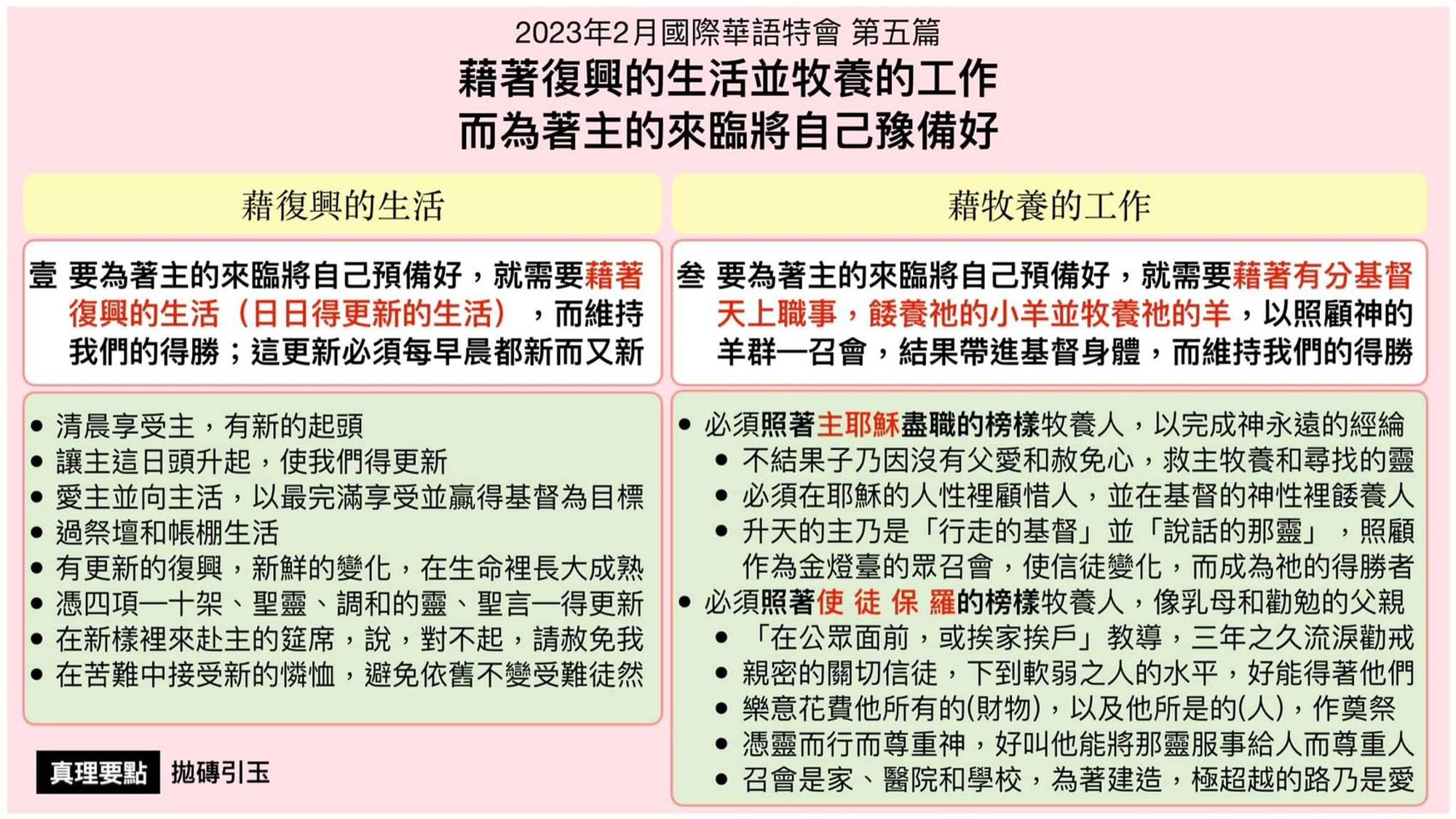 盼望我们能把时间和全人拚上去,尽力接触人 并牧养人。惟有这样,以弗所四章十二至十六节 所说基督身体的生机建造,与林前十四章二十 六节所说相互性的聚会,纔能在我们中间实行 并应验。为此,我们必须有晨晨复兴,日日得胜 的生活作基础;并且有这种爱主的生活和工作, 来维持我们的得胜。若没有复兴的生活并牧养 的工作,我们无法一直得胜,无法维持在得胜 里;能把我们维持在得胜里的,就是这种爱主的 生活和爱主的工作。这两面我们都需要。